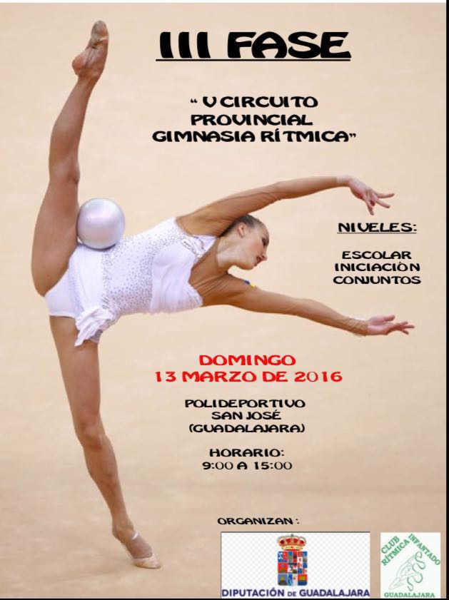 El polideportivo San José de nuestra capital acogerá el próximo domingo, 13 de marzo, a partir de las 9:00 horas la III Fase del V Circuito Provincial de Gimnasia Rítmica que promueve la Diputación de Guadalajara. La jornada, que se extenderá aproximadamente hasta las 15:00 y tendrá entrada libre y gratuita, se celebrará en las modalidades de escolar, iniciación y conjuntos.