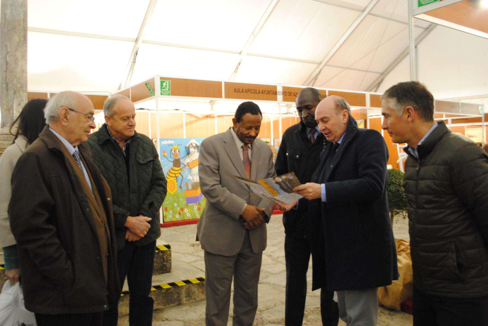 El presidente de la Diputación Provincial y de la Fundación Feria Apícola, José Manuel Latre, aprovechó ayer viernes la visita a Pastrana del embajador de Sudán, Mohamed Abdalla Abdelhameed Ahmed, para mostrarle los atractivos de nuestro sector apícola en la muestra internacional que se celebra estos días. De esta forma, junto al alcalde de Pastrana y vicepresidente de la Fundación, Ignacio Ranera; el gerente José Luis Herguedas, y el presidente de la Asociación de Apicultores, Ángel López Herencia, realizaron un recorrido por los stands de la Plaza de la Hora interesándose por las posibilidades del sector.