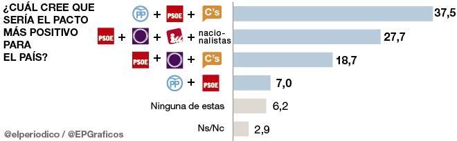 Cuatro de cada 10 electores, el 37,5%, apuestan como salida al rompecabezas de la investidura por la gran coalición a la que se agarra Mariano Rajoy para retener el poder: un pacto entre PP, PSOE y Ciudadanos. Así se desprende del Barómetro Político de España del Gabinet d'Estudis Socials i Opinió Pública (GESOP) para EL PERIÓDICO, efectuado a partir de 1.000 entrevistas justo después de la fallida investidura de Pedro Sánchez.