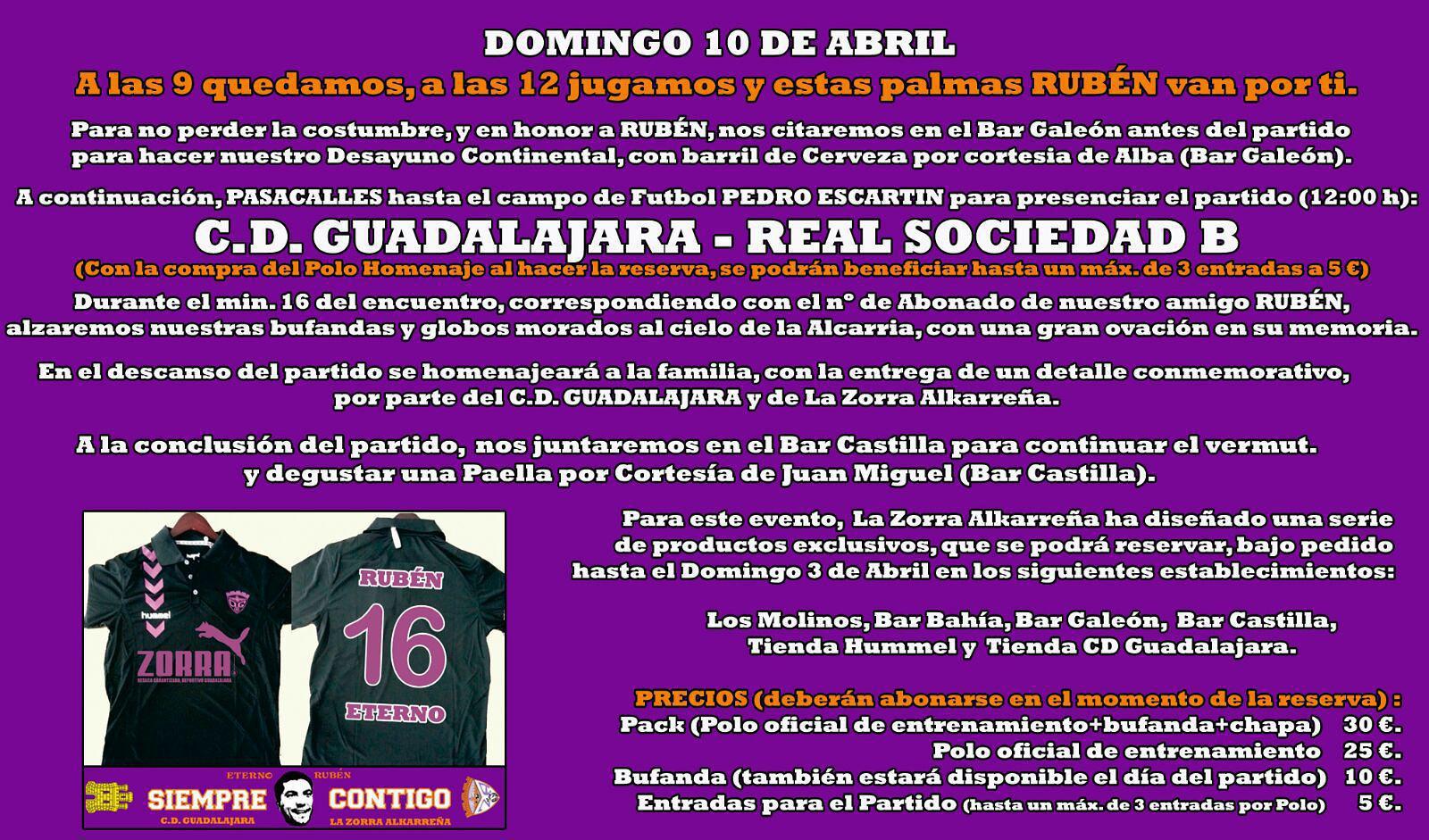 Cabe destacar que para este cita La Zorra Alkarreña ha diseñado una serie de productos exclusivos que se podrán reservar, bajo pedido hasta el domingo 3 de abril, en los siguientes establecimientos: Los Molinos, Bar Bahía, Bar Galeón, Bar Castilla, Tienda Hummel y Tienda Oficial del C.D. Guadalajara. Entre las prendas y accesorios creados para la ocasión, resalta la bufanda y el polo homenaje con el nombre de Rubén, su número y una estampación en la que se puede leer: eterno. Al hacer la reserva del polo, cualquier seguidor deportivista se podrá beneficiar de un máximo de tres entradas al precio de 5 euros cada una.