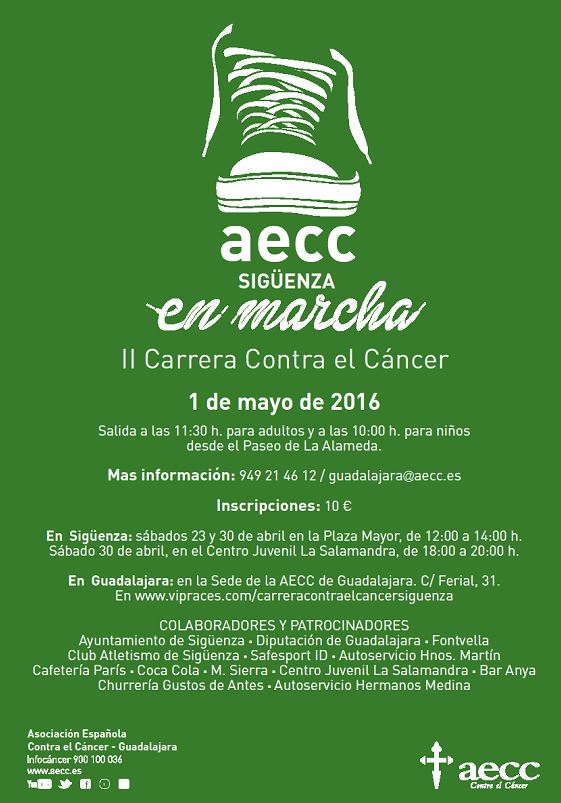 La Asociación Española Contra el Cáncer organiza la II Carrera Contra el Cáncer en Sigüenza (Guadalajara), a beneficio de esta entidad, que tendrá lugar el domingo 1 de mayo a las 11:30 horas los mayores y a las 10:00 los niños.