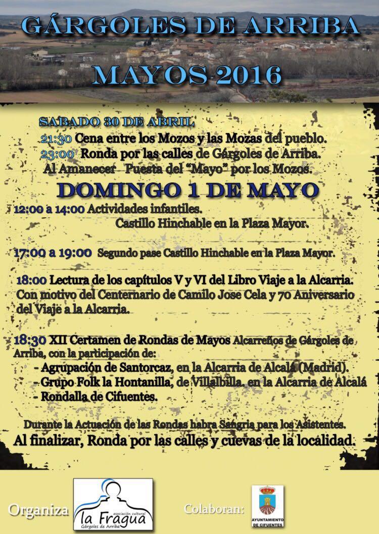 Con motivo del Centenario del nacimiento de Camilo José Cela y el 70 aniversario del viaje a la Alcarria, a las 6 de la tarde, se procederá a la lectura de los capítulos V y VI del libro “Viaje a la Alcarria”. A continuación, dará comienzo el XII Certamen de Rondas de Mayos Alcarreños de Gárgoles de Arriba, que en esta edición contará con la participación de tres rondas provenientes de distintos lugares de la geografía provincial y limítrofes de la provincia de Madrid. Las rondas que actuarán por el escenario gargoleño en este 2016 son: la Agrupación de Santorcaz, el Grupo Folk la Hontanilla y Grupo Ajedrea.