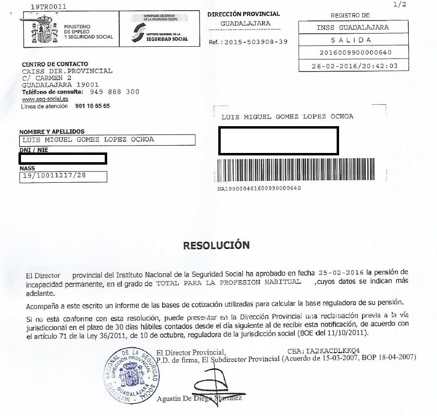 Bien pues decir que con fecha 25/02/2016 este trabajador del que se ha cuestionado tanto su estado, del que se ha sugerido públicamente una baja fraudulenta con el daño que esto ha supuesto para él y su familia durante todo este tiempo, ha recibido resolución del Instituto Nacional de la Seguridad Social declarando la Incapacidad Total en grado de Permanente de este.