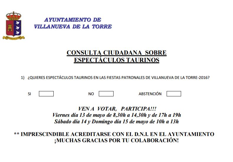 Villanueva de la Torre va a realizar su propia consulta sobre si tiene toros durante sus fiestas. Podrán votar en el Ayuntamiento a lo largo de todo el fin de semana todos aquellos empadronados mayores de 16 años que quieran hacerlo. La cita será el viernes, en horario de 8:30 a 14:30 y de 17:00 a 19:00; sábado y domingo de 10:00 a 13:00.