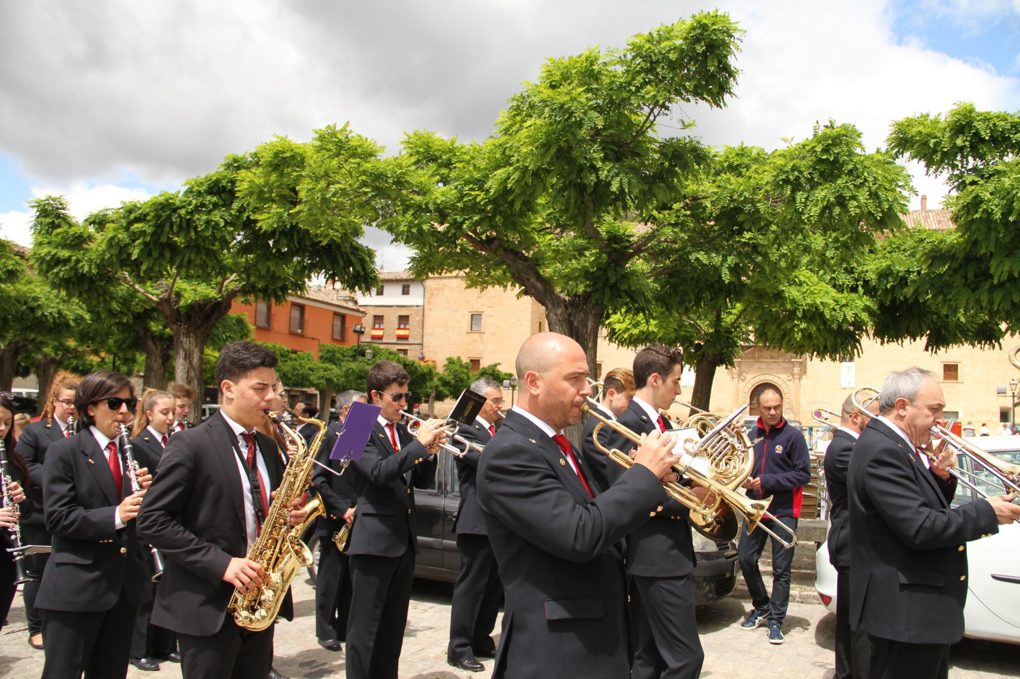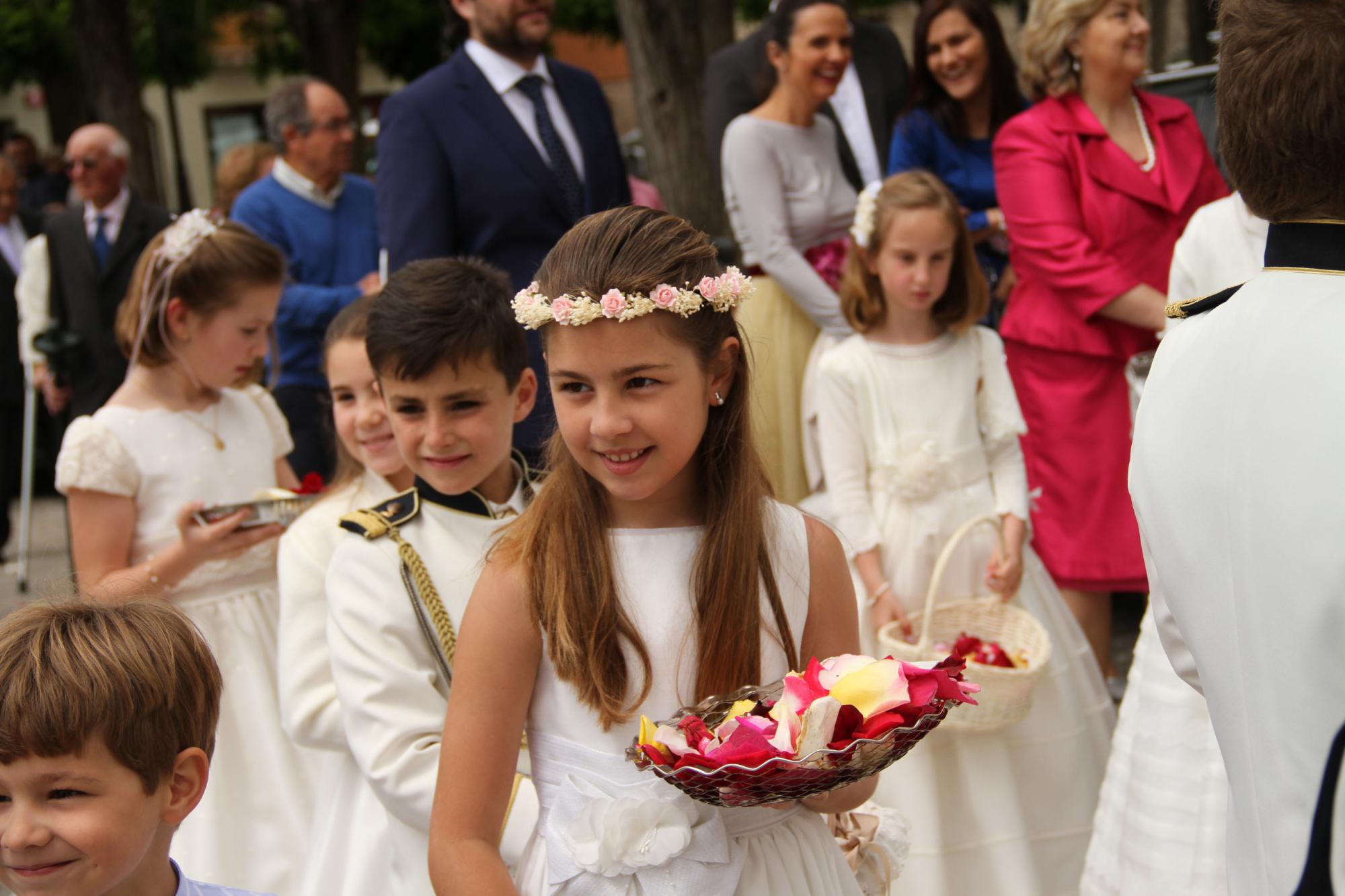 En la misma calle Mayor, los pastraneros habían erigido varios altares, uno de ellos levantado por los jóvenes que se van a confirmar este año. En todos se fue deteniendo la procesión, a la que precedía la Banda de Música de Pastrana. Delante del monumento, desfilaron las hermandades y cofradías de Pastrana, portando hasta doce estandartes diferentes, y los quince niños y niñas que este año han tomado la primera comunión.
