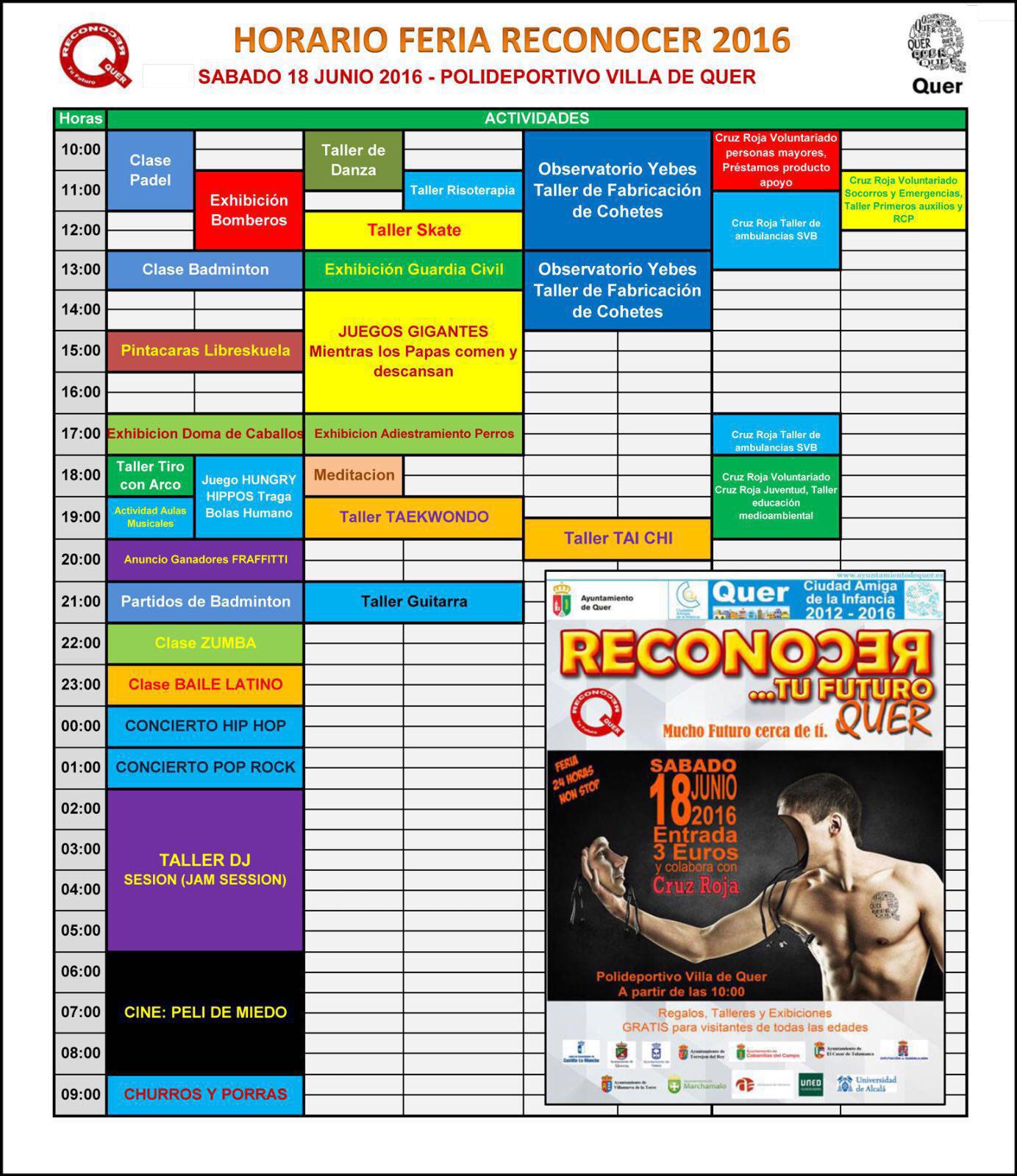 En 'Reconocer tu futuro en Quer' habrá en torno a cuarenta expositores diferentes, que serán agrupados en tres focos de interés principales: formación reglada, profesiones con futuro, y opciones deportivas. Además, y de forma paralela, están programadas otras treinta y cinco actividades repartidas en las 24 horas que va a durar la feria. Todas le añadirán el componente del ocio y la diversión a la búsqueda y encuentro de opciones de futuro para los jóvenes que favorece la organización y que es el propósito de esta feria. La entrada a la feria cuesta tres euros. Una parte de la recaudación va a ser entregada a Cruz Roja.