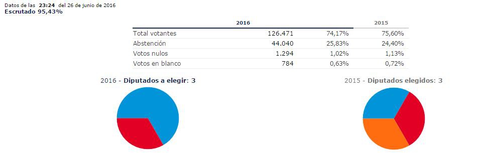 Esa tendencia provincial y regional ha sido mucho más marcada a nivel nacional. El Partido Popular ha logrado 137 escaños, 14 más que los 123 de diciembre. La segunda fuerza política ha vuelto a ser el Partido Socialista, que en contra de lo que decían las encuestas no ha sido superado por Unidos Podemos. Sin embargo, ha perdido 5 diputados, pasando de los 90 a los 85.