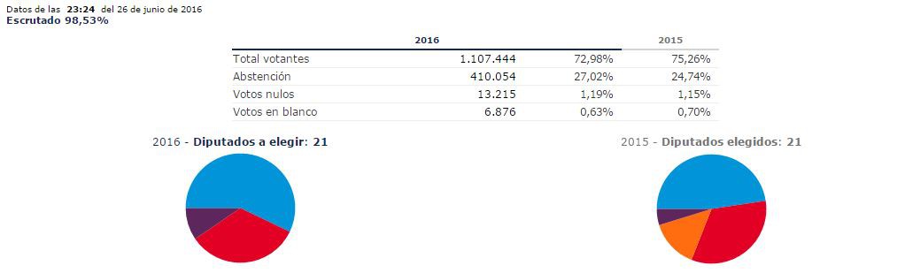 Unidos Podemos ha obtenido un resultado de 71 escaños, los mismo logrados anteriormente por Podemos y Unidad Popular. Por su parte, Ciudadanos ha sido el más castigado en las urnas, perdiendo 8 de los 40 escaños logrados el 20D y quedándose en 32.