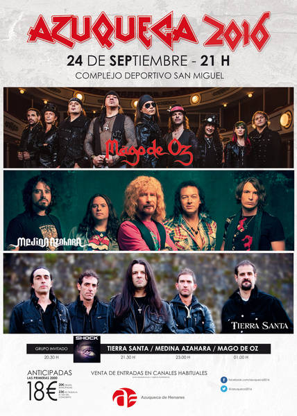 Este lunes, se han puesto a la venta las entradas para el concierto organizado por el Ayuntamiento de Azuqueca el día 24 de septiembre con Mago de Öz, Medina Azahara y Tierra Santa como cabezas de cartel y la formación local Shock como grupo invitado.