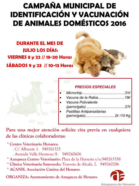 La campaña se va a desarrollar los viernes 8 y 22 de julio, por las tardes, de 18 a 20 horas, y los sábados 9 y 23, por las mañanas, de 10 a 13 horas. Los precios establecidos son los mismos del año pasado: 31 euros, para la colocación de microchip; 18 euros, la vacuna contra la rabia; 27 euros, la vacuna polivalente y 2 euros por cada 10 kilos de peso del animal, para las pastillas antiparasitarias.