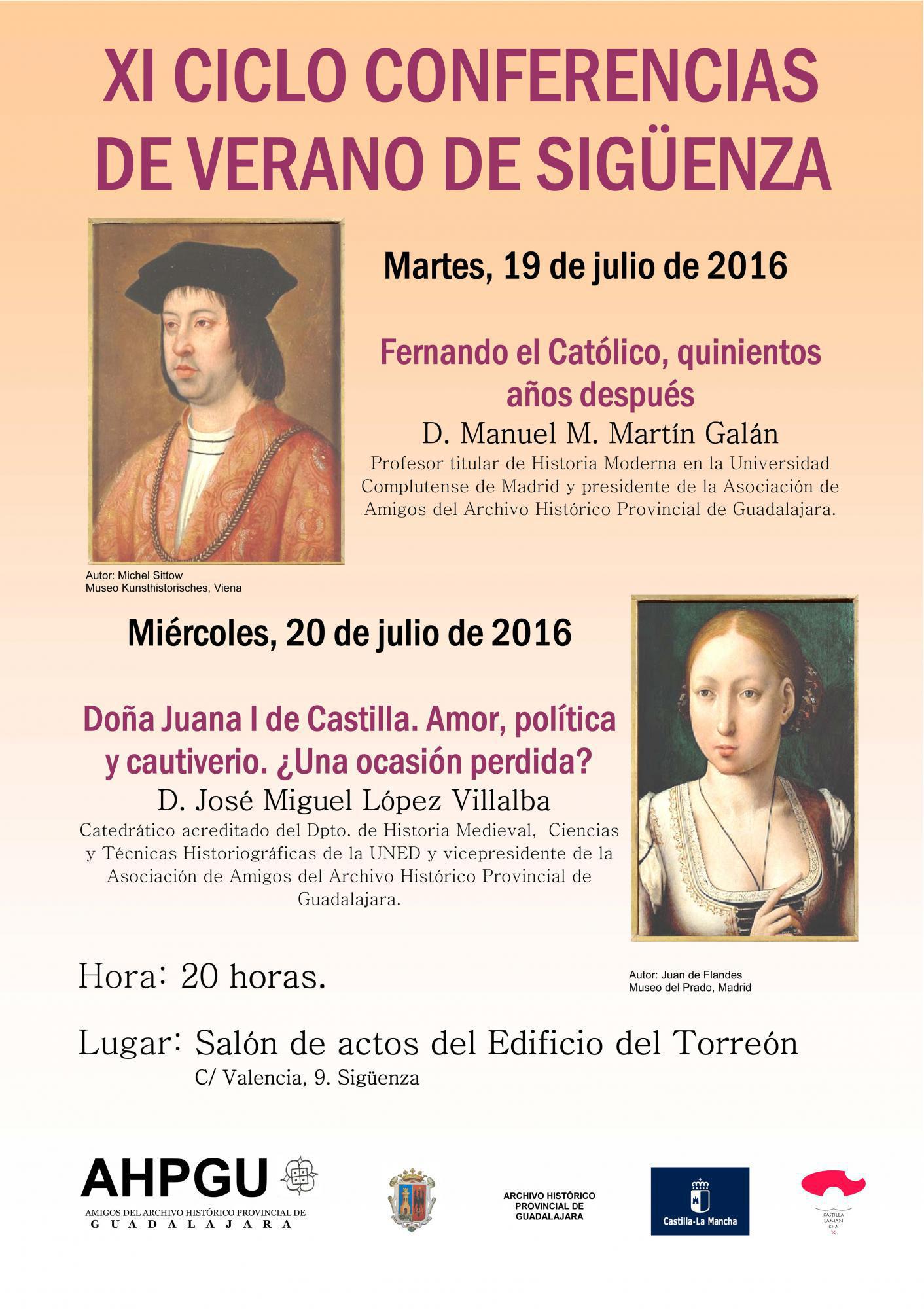 El miércoles, día 20 de julio, José Miguel López Villalba, catedrático habilitado de la UNED en Ciencias y Técnicas Historiográficas y vicepresidente de la Asociación de Amigos del Archivo Histórico Provincial de Guadalajara, hablará sobre “Doña Juana I de Castilla. Amor, política y cautiverio. ¿Una ocasión perdida?”.