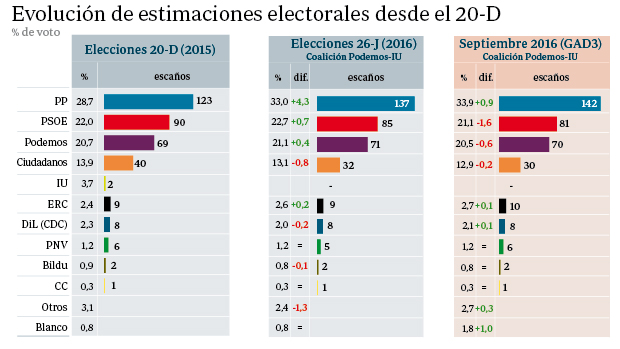Las urnas acentuarían las tendencias que ya se vieron el 26 de junio, pero apenas servirían para cambiar el panorama, ya que la división se mantendría y existirían prácticamente las mismas dificultades para formar Gobierno. Según la encuesta de GAD3 realizada para ABC, el PP sumaría otros cinco diputados, hasta llegar a los 142, mientras que el PSOE, Podemos y Ciudadanos volverían a perder terreno. La necesidad de un acuerdo seguiría siendo la misma que en la actualidad y con idénticos protagonistas.