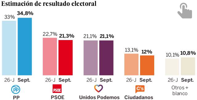 El Partido Popular sería de nuevo el más votado e incluso vería incrementado en casi dos puntos su porcentaje de apoyo. Subiría del 33% que obtuvo el pasado 26-J a un 34,8% estimado. PSOE y Ciudadanos retrocederían en porcentaje de voto.