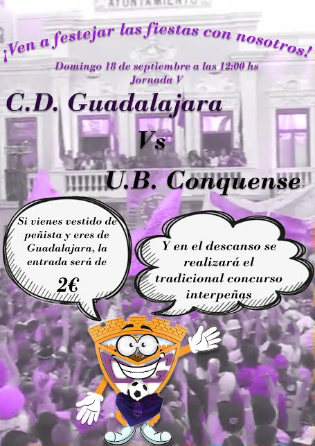El C.D. Guadalajara quiere que las fiestas de su ciudad se trasladen a las gradas del Municipal Pedro Escartín en el encuentro ante la U.B. Conquense del próximo domingo 18 de septiembre. Para ello, y con motivo de las Ferias de la capital alcarreña, se premiará a las peñas oficiales de Guadalajara con un descuento especial en el precio de las entradas: 2 euros por cada una de ellas (a recoger en taquillas).