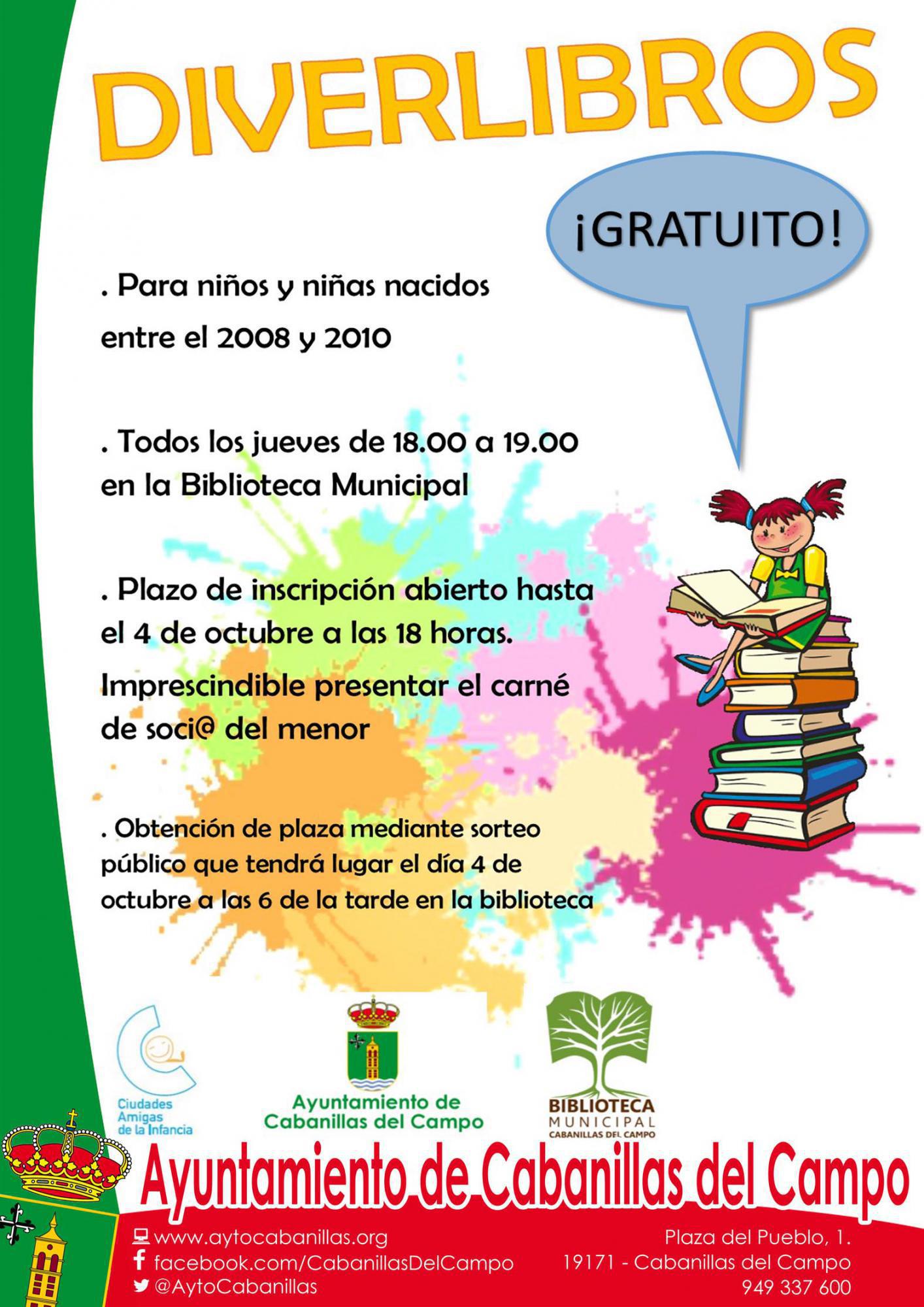 La Biblioteca Municipal de Cabanillas del Campo va a incrementar sus proyectos de animación a la lectura con un nuevo programa, que se suma a los ya convocados de “Bebeteca” (de 0 a 3 años) y “Pequeteca” (de 3 a 5 años). Se trata del “Diverlibros”, destinado en esta ocasión a niños y niñas de 6 a 8 años de edad (en concreto, a nacidos entre los años 2008 y 2010, ambos inclusive).
