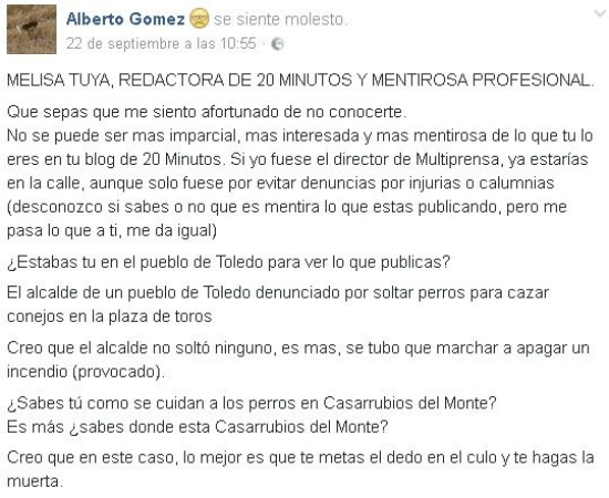 En una nota de prensa, Calypo Fado ha denunciado que Gómez Mayoral "insulta e intenta vejar con afirmaciones y expresiones vulgares, vomitivas y que repugnan al sentido común y la buena educación" en un escrito dirigido a la periodista el pasado día 22 de septiembre en su cuenta de Facebook, según el texto de la red social que ha adjuntado la formación.