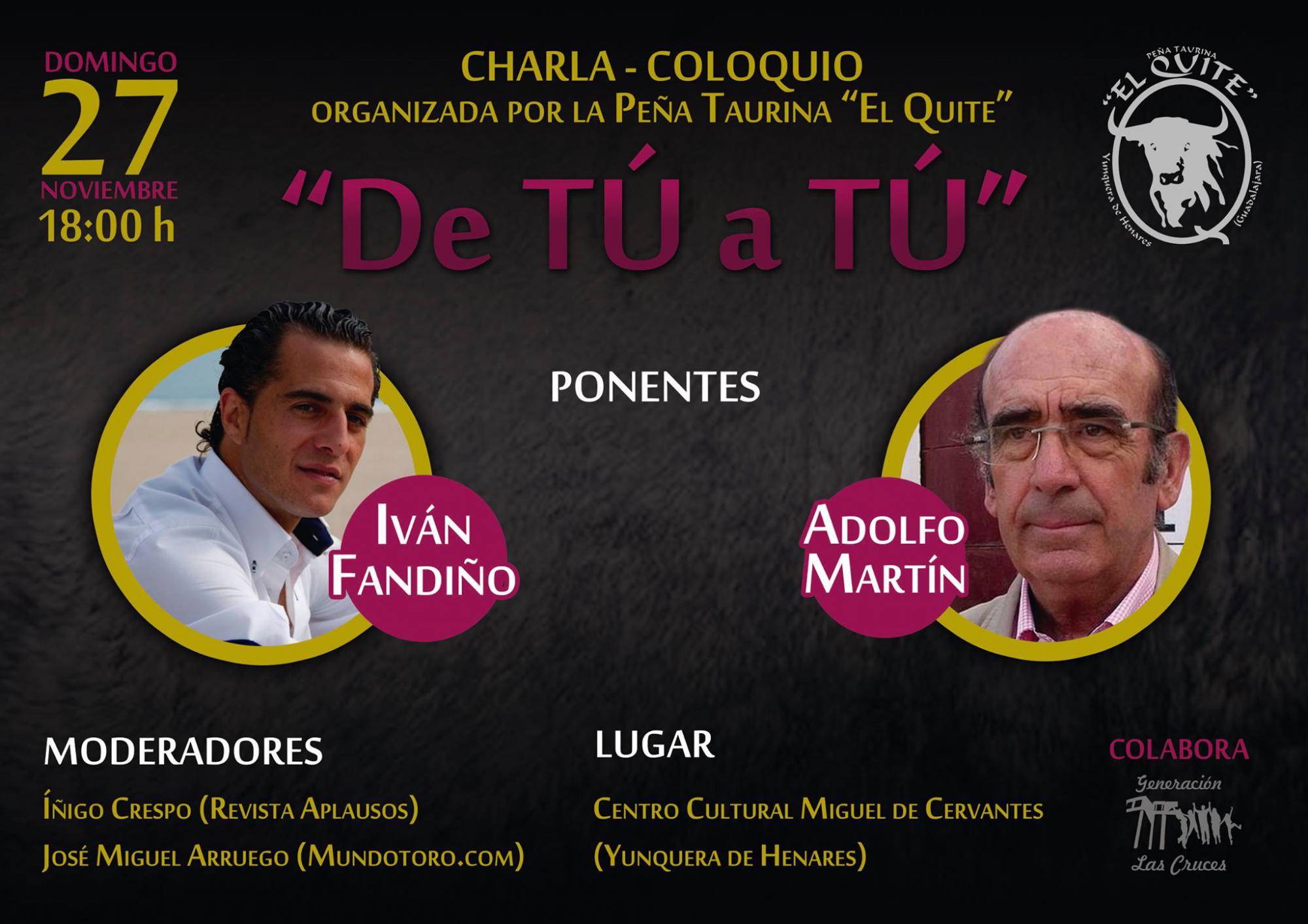 Iván Fandiño compartirá cartel con el ganadero, Adolfo Martín el próximo domingo, 27 de noviembre en la localidad de Yunquera de Henares (Guadalajara) en una charla-coloquio.