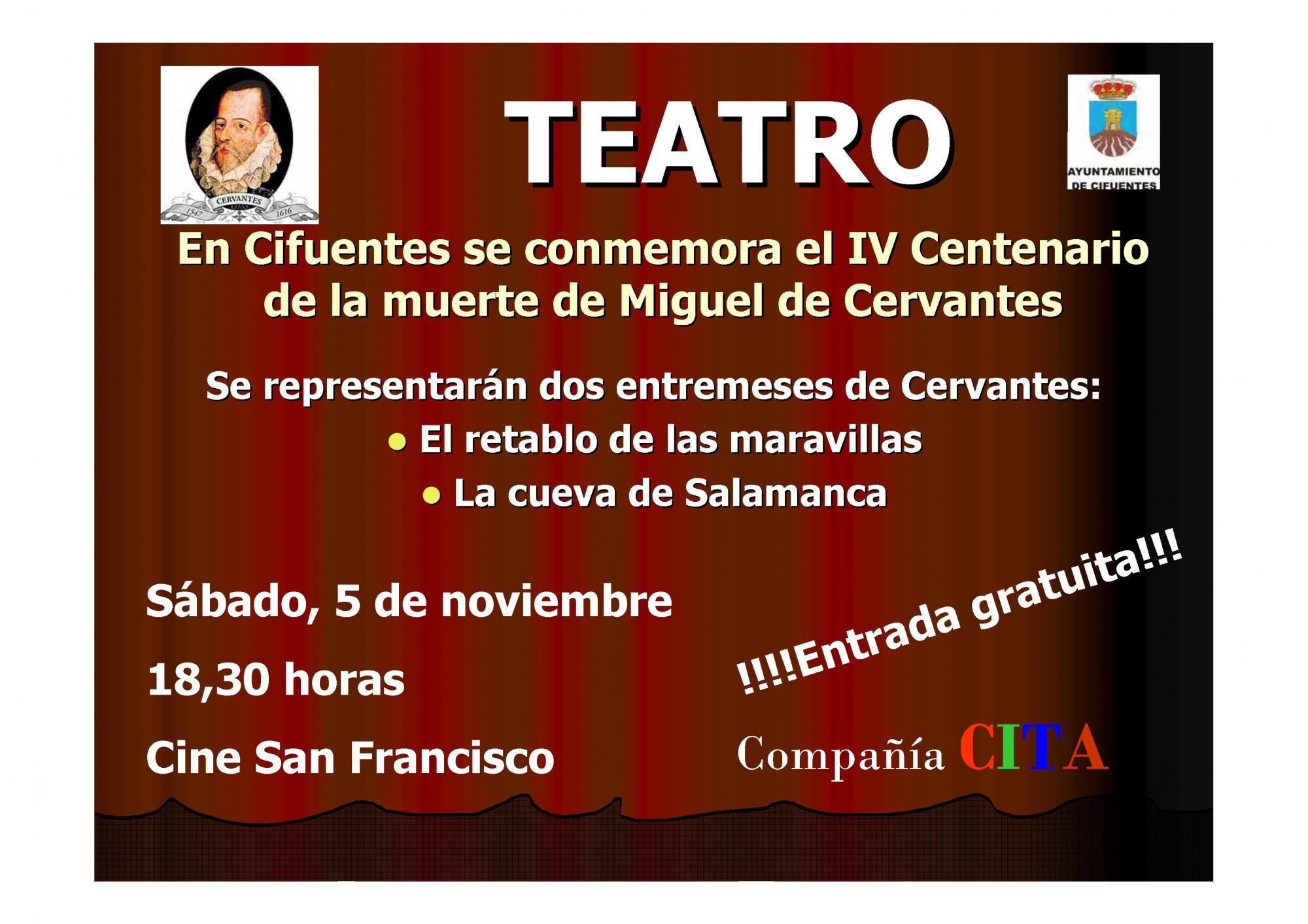 A fin de conmemorar el IV Centenario de la muerte de Miguel de Cervantes, la compañía de teatro “CITA” (Compañía Inestable de Teatro de Arganda), representará el próximo sábado 5 de noviembre, a las 18,30 horas, en el teatro San Francisco de Cifuentes, dos entremeses de Cervantes; El retablo de las maravillas y La cueva de Salamanca.