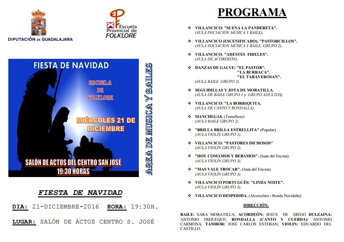 Bajo la dirección de Sara Moratilla (baile),Jesús de Diego (acordeón), Antonio Trijueque (dulzaina), Antonio Carmona (canto y cuerda), José Carlos Esteban (tambor) y Eduardo del Castillo (violín), los alumnos del Área de Música y Bailes de la Escuela ofrecerán un amplio programa compuesto por villancicos y algunas de las piezas más significativas del folklore tradicional de la provincia de Guadalajara