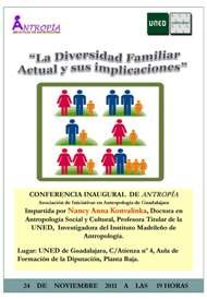 El jueves 24 de noviembre, a partir de las 19 horas en el Aula de formación de la Diputación Provincial (planta baja del Centro San José), tendrá lugar la presentación de la asociación Antropía. A continuación la profesora Nancy Anna Konvalinka, profesora titular de la UNED, doctora en Antropología Social y Cultural e investigadora en el Instituto Madrileño de Antropología impartirá la conferencia que con el título “La diversidad familiar actual y sus implicaciones” abordará las nuevas formas de emparejamiento actual: familias monoparentales con hijos biológicos o adoptados, familias homoparentales con hijos, unión de parejas divorciadas con los hijos de ambos,… Estas nuevas formas de relación familiar tienen consecuencias sociales variadas y hacen replantearse la imagen tradicional de la familia.