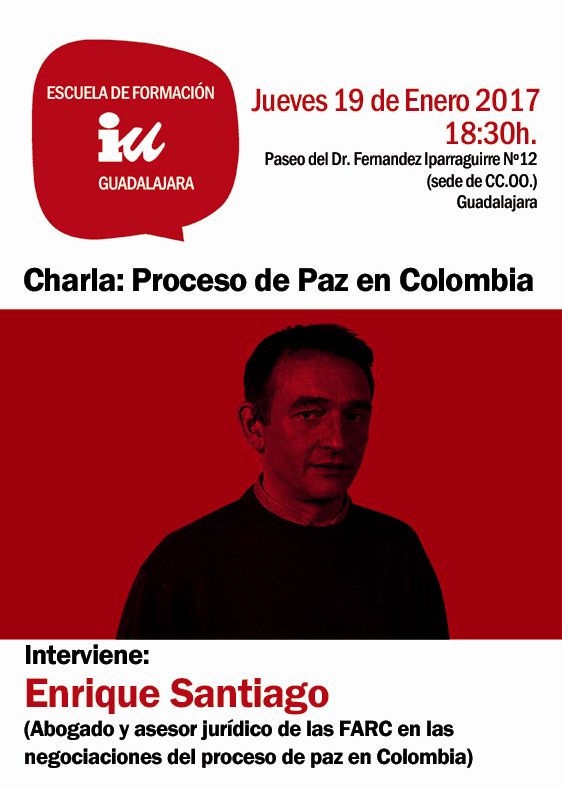 La Escuela de Formación de IU sigue caminando, su próxima parada el jueves 19 de enero a las 18:30 horas en el salón de actos de Comisiones Obreras en Guadalajara capital. IU se asoma fuera de nuestras fronteras eligiendo un asunto que ha sido máxima actualidad durante el 2016: el Proceso de Paz de Colombia, de la mano de uno de sus protagonistas. Enrique de Santiago Romero, dirigente y abogado de Izquierda Unida y PCE, ha participado en calidad de asesor de las Fuerzas Armadas Revolucionarias de Colombia (FARC) en el proceso de conversaciones con el Gobierno colombiano en La Habana.