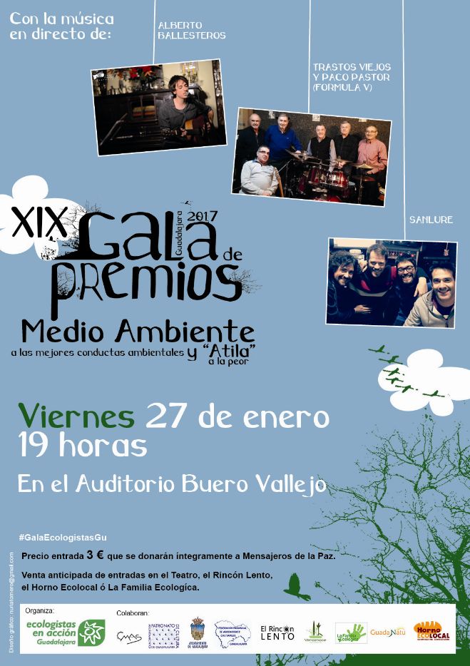 La Gala de Premios de Medio Ambiente, que celebra anualmente Ecologistas en Acción de Guadalajara, tendrá lugar el próximo viernes 27 de enero de 2017 a partir de las 19 horas en el Teatro Auditorio Buero Vallejo de la capital, y contará entre otros, con Juan López de Uralde, co-portavoz de EQUO y ex-director de Greenpeace España, Olga Lucas, viuda de José Luis Sampedro, el Padre Ángel, de Mensajeros de la Paz o Paco Pastor, de Formula V.