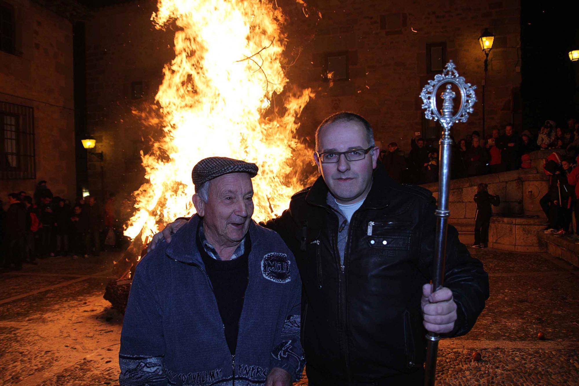 El foco de atención se ha trasladado entonces hasta la Plaza del Doncel. Allí, perfectamente colocada, estaba ya la pira de la Hoguera de San Vicente, cuya leña se encargan de recopilar los hermanos cofrades. Este año tenía generosas dimensiones. En su centro, un pino, entresacado de La Pinarilla, con los puntitos de color que le daban las naranjas y mandarinas. Según cuentan, hacen alusión al lugar donde el santo fue martirizado. Además, siempre fue costumbre en el “bibitoque” del día 23, entregárselas a los niños, en una época en la que no eran tan frecuentes.