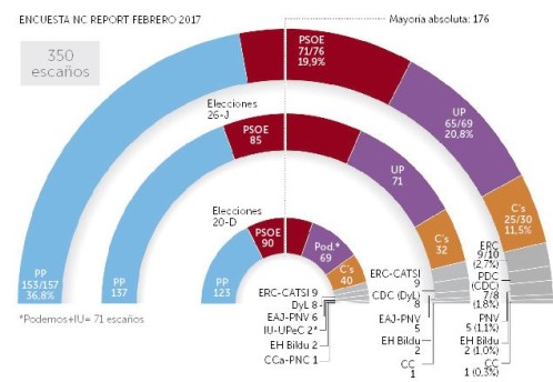 Asi pues, según los datos del sondeo de ABC, el PP obtendría 146 escaños y un 34,2 por ciento frente a los 137 escaños de las elecciones generales de junio de 2016, una significativa subida que no refleja ningún otro partido. El PSOE, por su parte, se quedaría con 78 escaños frente a los 85 actuales, con un total del 20,4 por ciento de los votos. Unidos Podemos obtendría 70 escaños con un 20,8 por ciento y Ciudadanos se quedaría con los 32 actuales y un 13,8 por ciento.