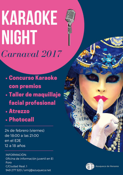 Con motivo del Carnaval, el Ayuntamiento de Azuqueca de Henares organiza en el Espacio Joven Europeo (EJE) la fiesta 'Karaoke Night'. "Se trata de una propuesta de ocio saludable para jóvenes con edades comprendidas entre las 12 y los 18 años", explica la concejala del área, Carmen Luque, quien recuerda que la actividad no requiere inscripción previa y que se ha programado este viernes, 24 de febrero, por la tarde, de 18 a 21 horas.