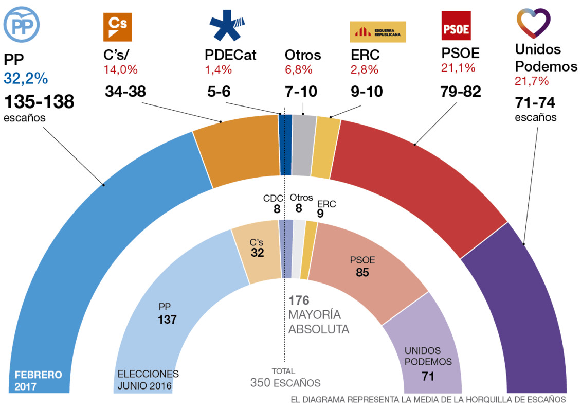 Los partidos de Mariano Rajoy y Albert Rivera suman actualmente en el Congreso 169 escaños y ambas fuerzas mejorarían sus resultados actuales y podrían llegar hasta los 176 diputados, justo el listón de la mayoría absoluta, según esta encuesta. Ambos líderes se benefician en este sondeo, elaborado a partir de 1.000 entrevistas del 19 al 22 de febrero, del contraste entre la relativa placidez con la que superaron sus respectivos congresos, con escasa contestación interna, y el estado de ebullición en el que se desarrolló la asamblea de Podemos y en el que se desarrollan ya las primarias del PSOE.