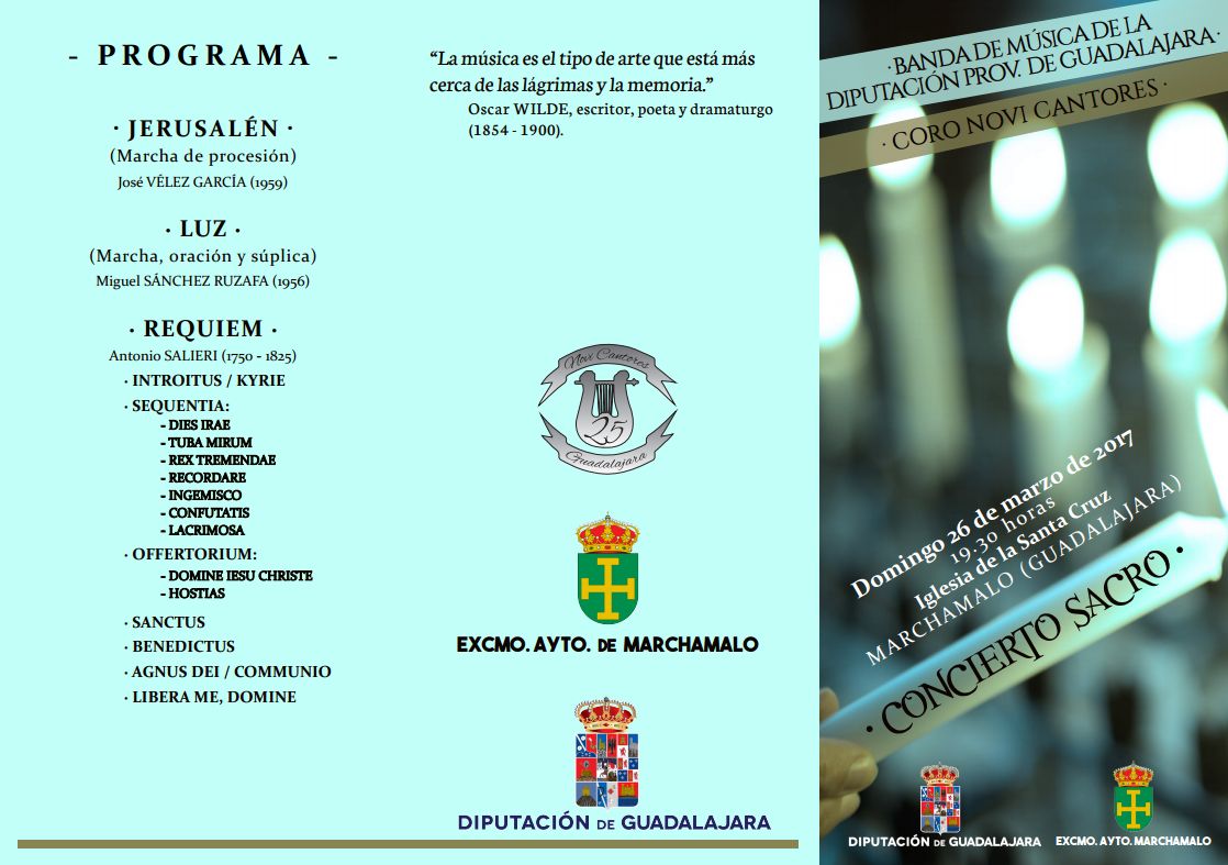 Nuevamente bajo la dirección de Nuria Matamala se reúnen la Banda y Novi Cantores para ofrecer dos "Conciertos sacros" como ya hicieron en el mes de marzo del año pasado en Quer y en la capital (concretamente en la Concatedral), en aquella ocasión con un programa de Franck y Fauré, entre otros. Para esta ocasión han escogido la obra "Jerusalén" de un autor contemporáneo como el murciano José Vélez García (Calasparra, 1959) que es una marcha muy emotiva y dinámica, seguramente inspirada en la procesión que se realiza, sin imágenes, el Domingo de Ramos en su pueblo; a la que seguirá "Luz" de otro autor también contemporáneo como el alicantino Miguel Sánchez Ruzafa (Sax, 1956) con una amplia formación académica y una intensa actividad como director sin descuidar su faceta compositora como es el caso de esta preciosa marcha; y cerrarán el programa con el "Réquiem" de Salieri, prolífico músico de gran valía y talento nacido en Venecia y fallecido en Viena cuyo mérito está oscurecido por la supuesta rivalidad con el gran Mozart, que había escrito para su propia muerte y que fue dirigido por Schubert en su funeral.
