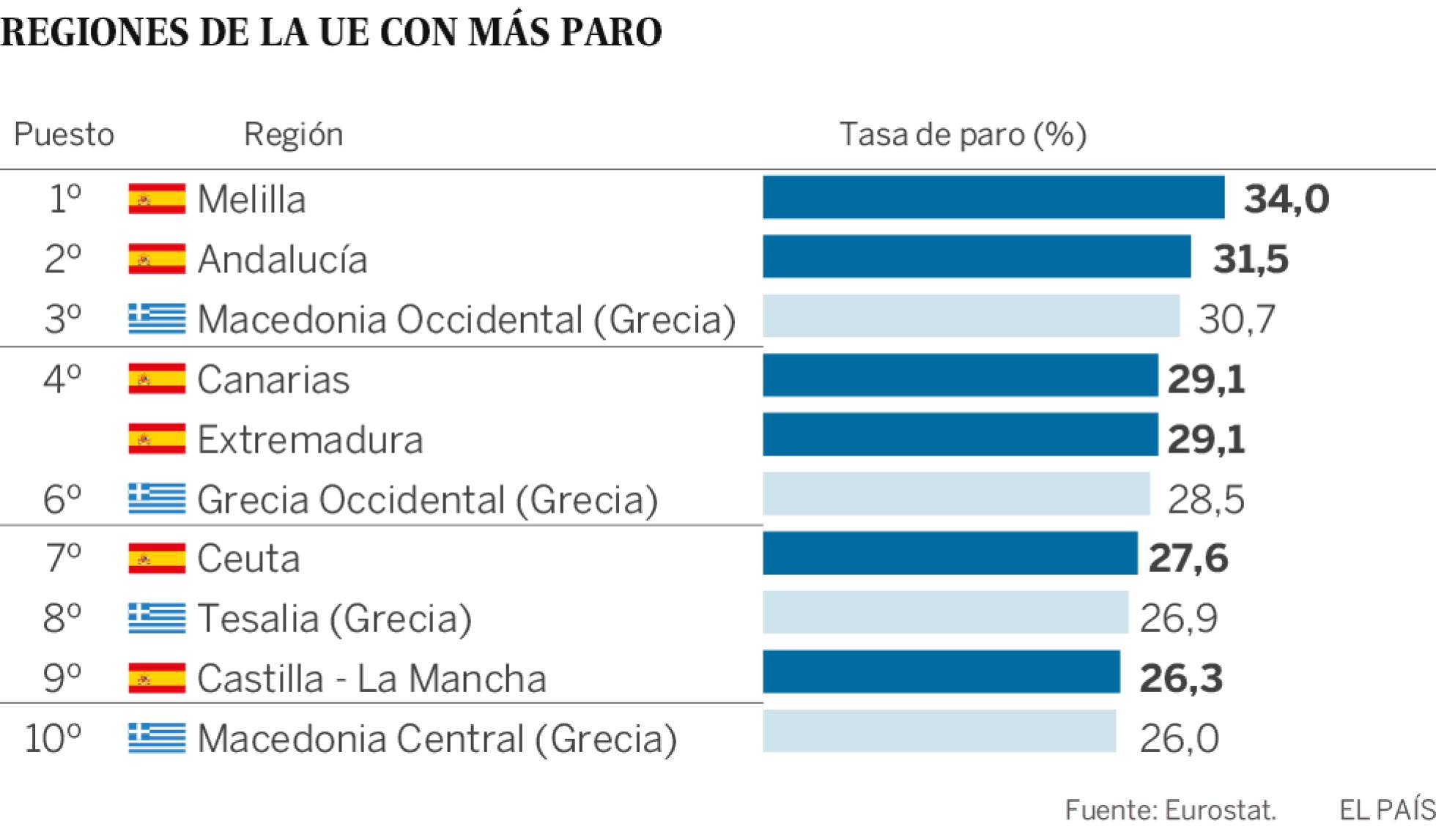 El furgón de cola comunitario en materia laboral tiene su centro de gravedad al sur de la Unión. Melilla (34%) y Andalucía (31,5%) son los territorios con mayor tasa de paro, y junto a la griega Macedonia Occidental, las únicas que superan el umbral del 30%. Canarias, Extremadura, Ceuta y Castilla-La Mancha —de nuevo el sur— completan la presencia española entre la decena de regiones con menos oportunidades de encontrar trabajo.