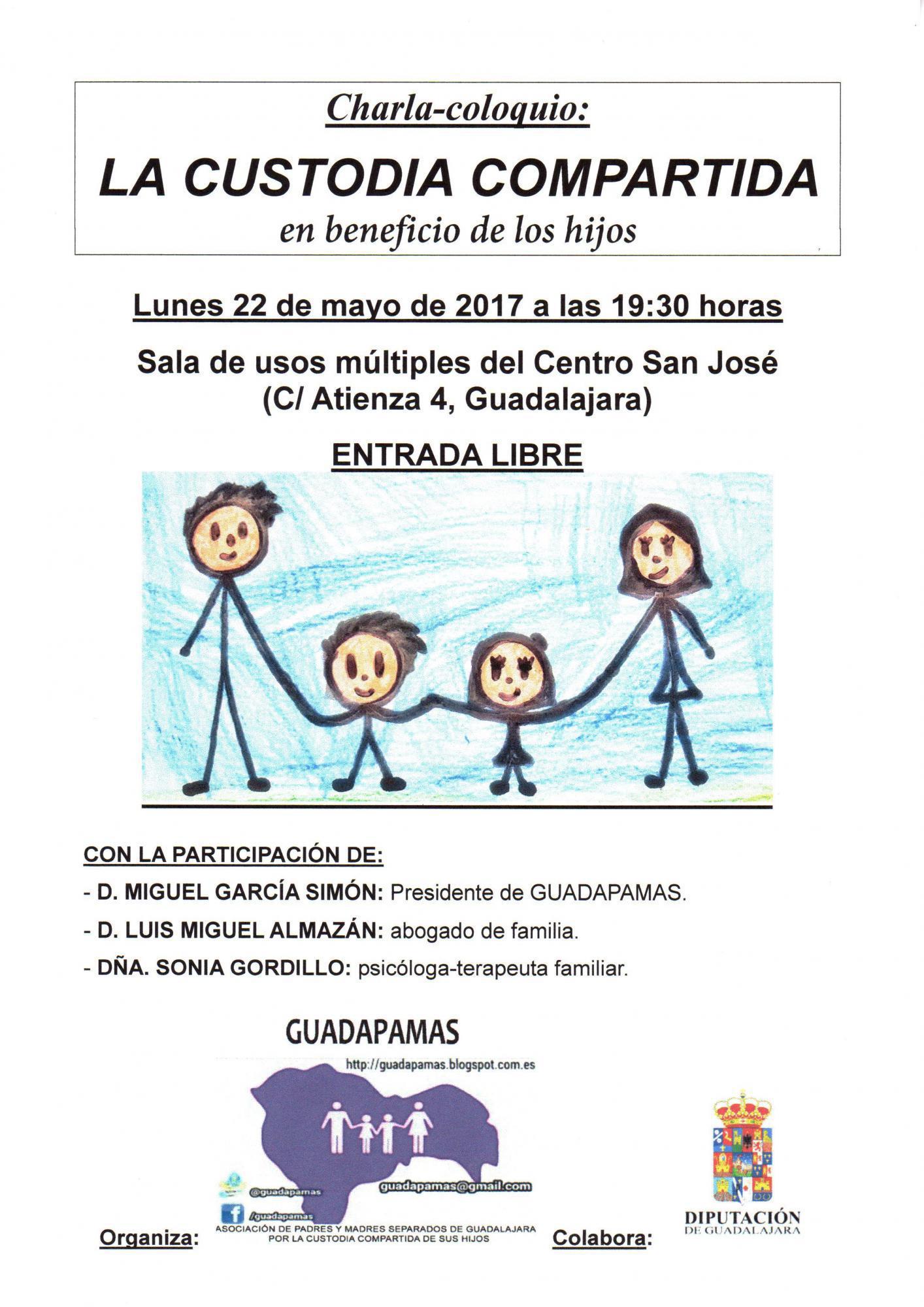 La Asociación de padres y madres separados de Guadalajara (GUADAPAMAS) ha organizado para el próximo lunes 22 de mayo a las 19:30 horas en la Sala de usos múltiples del Centro San José de Guadalajara (Calle Atienza, 4) una charla-coloquio titulada "La custodia compartida en beneficio de los hijos", en donde se tratará y se debatirá sobre el estado actual de la custodia compartida de los hijos en procesos de separación o divorcio de sus padres.