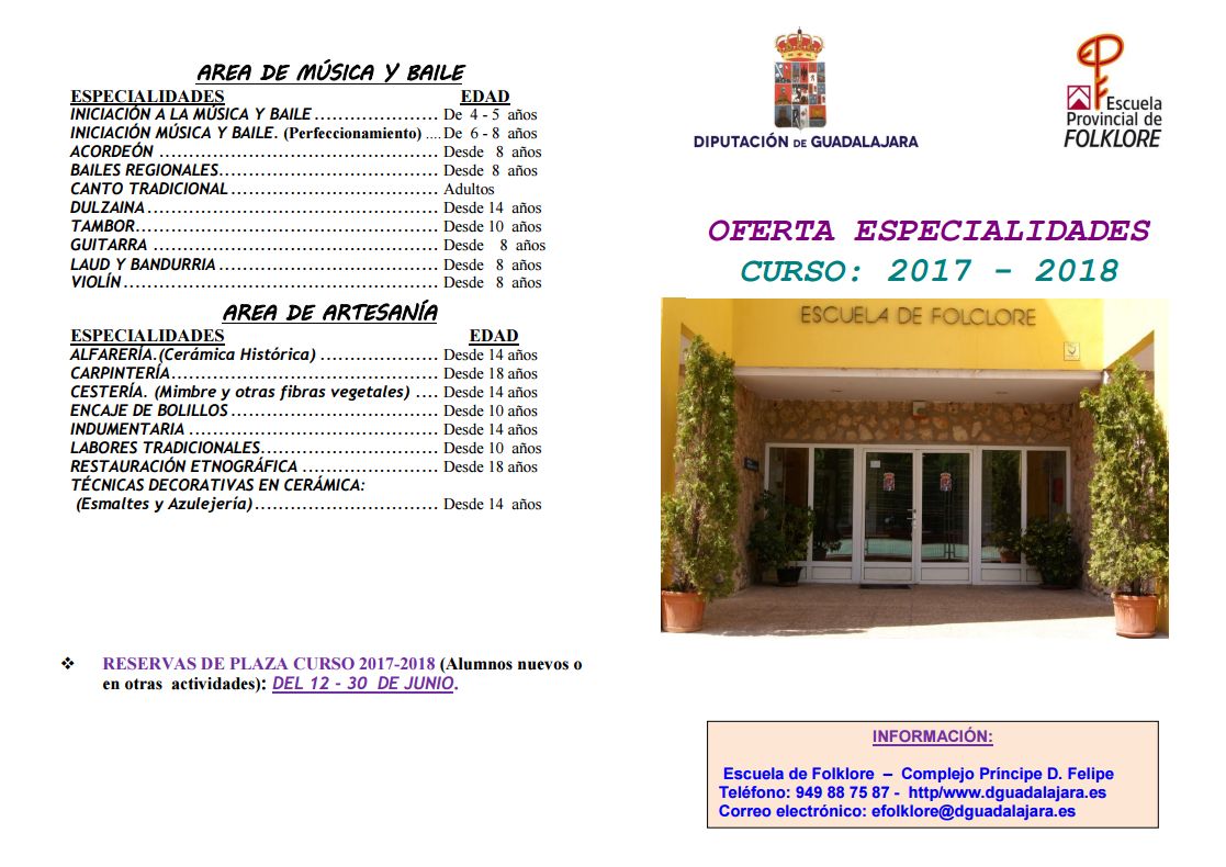 Desde el próximo lunes, 12 de junio, y hasta el viernes 30 estará abierto el plazo de reserva de plaza para el curso 2017-2018 en la Escuela de Folklore de la Diputación de Guadalajara.