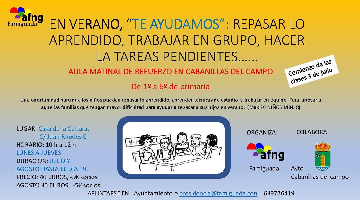 La Asociacion de Familias Numerosas de Guadalajara, en colaboración con el Ayuntamiento de Cabanillas del Campo, ha puesto en marcha este año un "Aula matinal" de verano, con la que se pretende ayudar a repasar a los niños y niñas de Primaria de la localidad que necesiten reforzar lo aprendido en el curso escolar.