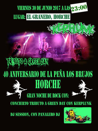 La Peña “Los Brujos” de Horche celebrará por todo lo alto sus 40 años de existencia este fin de semana con dos conciertos de rock de entrada totalmente gratuita. El primero de ellos tendrá lugar mañana viernes, 30 de junio, a las 23.00 horas en El Granero de la localidad horchana. Como plato fuerte de la noche, actuará Kerplunk, grupo guadalajareño de versiones de Green Day. Precisamente, el nombre de la banda hace referencia a uno de los discos más famosos del trío estadounidense. Con mucha energía y bastante conocimiento de la formación original, Kerplunk repasan toda la trayectoria de la banda de Billie Joe Armstrong. Subidón de adrenalina para el comienzo de la velada. El resto de la noche, hasta alrededor de las tres de la madrugada, correrá a cargo de DJ Panalero, pinchadiscos residente en la peña “Los Brujos”, que tiene previsto poner cuarenta canciones -tantas como los años que cumple la peña- que hayan sido éxitos desde 1977 hasta la actualidad.