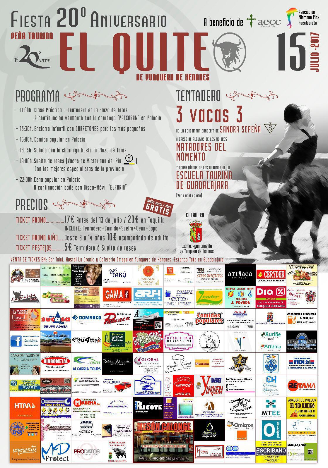 Puedes conseguir tu abono anticipado (Tentadero - Comida+Refresco - Suelta de Vacas - Cena - Copa) por solo 17€ en los puntos de venta autoridados. Bar Tabú, Cafetería Ortega y Hostal La Granja en Yunquera de Henares, así como en el Estanco Tote de Guadalajara. El mismo dia 15 de Julio, también podrás retirar tu abono en taquilla por un precio de 20€, así como las entradas para los dos festejos taurinos, por 5€ cada uno.