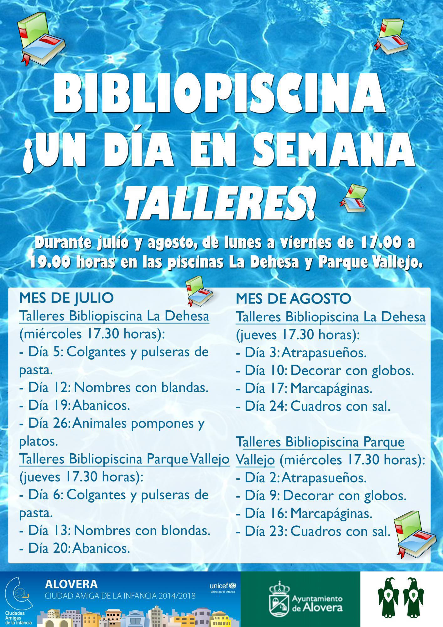 Todas las semanas se van a realizar talleres en ambas piscinas, los miércoles en la Dehesa y los jueves en Parque Vallejo. El horario de la Bibliopiscina para es por las tardes de 17,00 a 19,00, de lunes a viernes y en el mes de julio, los lunes, miércoles y viernes la actividad se realiza en la Dehesa y martes y jueves en Parque Vallejo. En agosto cambian.