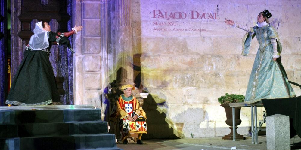 Después de un día intenso de diversión, conferencias, títeres y mercado del Siglo de Oro, la noche del sábado empezaba con la actuación del Grupo de Teatro Moratín, que interpretó un entremés obra del mismísimo Miguel de Cervantes titulado 'El viejo celoso'. VER ENTREVISTA CON LOS ACTORES DEL GRUPO MORATIN. Cumpliendo exactamente con el propósito originario de este tipo de representaciones, el sainete sirvió como transición hasta llegar a la que iba a ser la obra central del Festival Ducal, que, dirigida por el pastranero Javier Gumiel, también autor de los textos. Llevó por título 'Ana de Mendoza, de dama a cautiva'. Gumiel, director de teatro de la Asociación de Damas y Caballeros, se estrenaba este año como director artístico del Festival Ducal, siéndolo además por aclamación popular. El repaso biográfico de la trayectoria vital de la Princesa de Eboli estuvo pleno de sensibilidad y buen gusto, y jalonado de detalles que le aportaban vistosidad al espectáculo. La representación implicó a todas las asociaciones de Pastrana. La Banda de Música, Asociación de Damas y Caballeros y la Coral de La Paz, dieron los mejor de sí mismas para reivindicar la figura, tantas veces vilipendiada por la historia, de Ana de Mendoza.