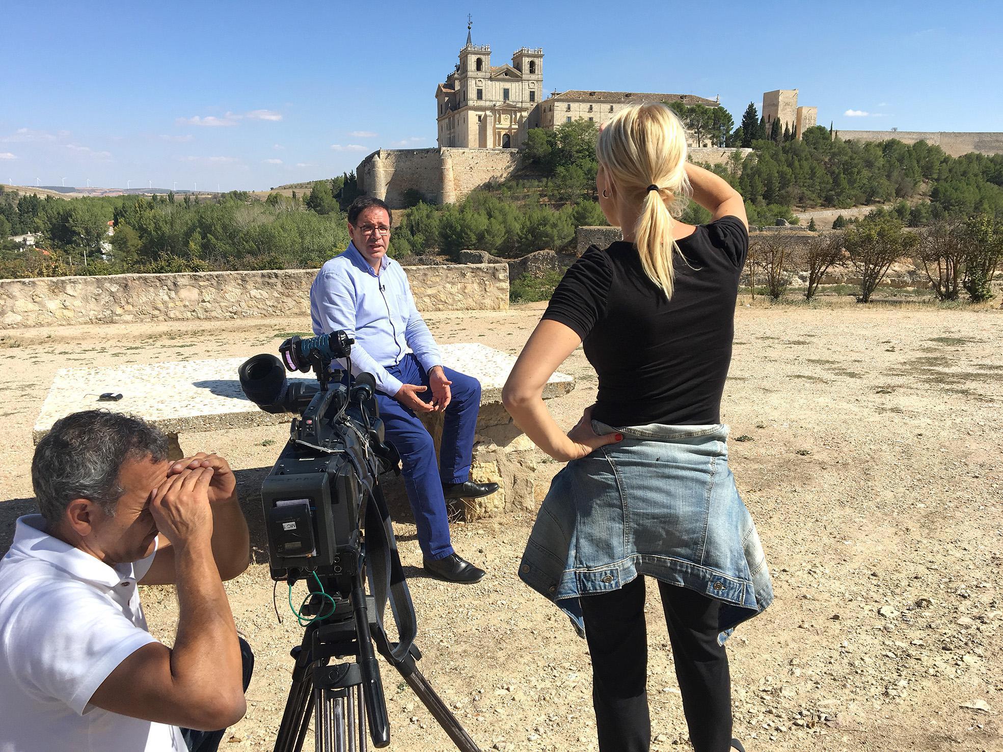 La reportera Adriana Navarro y su cámara Luis Alberto Porras llegaban a Cuenca el pasado lunes y permanecerán aquí una semana. El presidente de la Diputación Provincial de Cuenca, Benjamín Prieto, los recibía en el Monasterio de Uclés que fue la primera toma de contacto de este equipo con el patrimonio de la provincia.