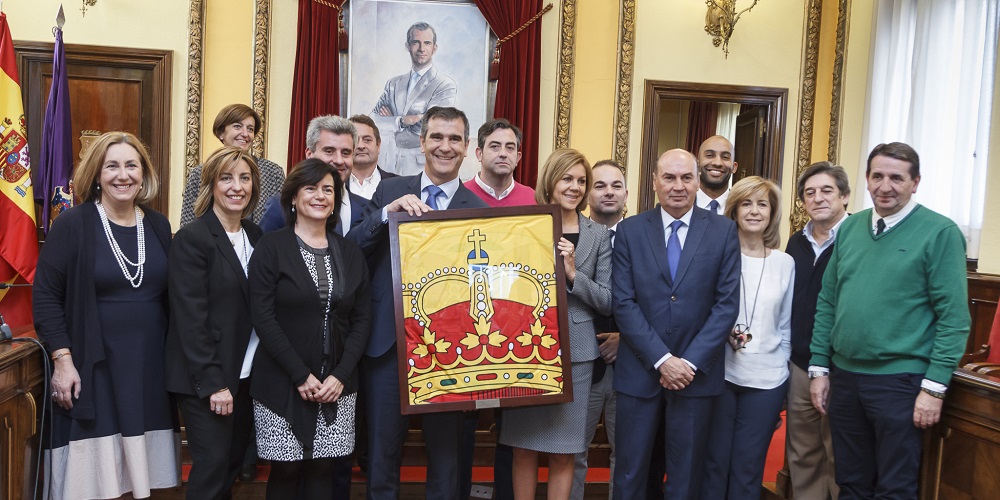 La ministra de Defensa, María Dolores de Cospedal, ha entregado al alcalde de Guadalajara, Antonio Román, la bandera nacional que ondeó en la ciudad durante la celebración, el pasado 27 de mayo, del Desfile de las Fuerzas Armadas.