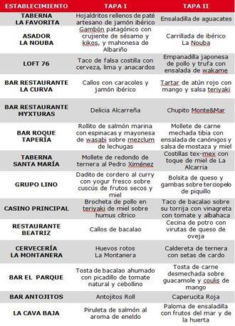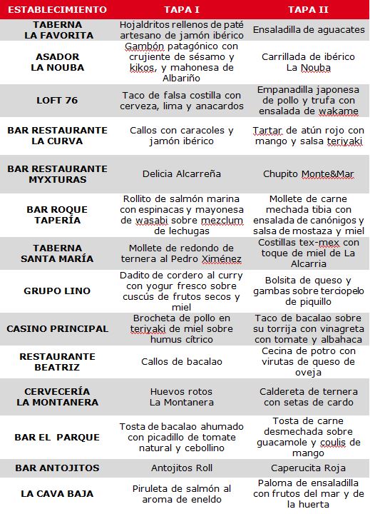La oferta de tapas es muy variada, lo que hará las delicias de todos los paladares. Las creaciones van desde la cocina más tradicional hasta las propuestas más innovadoras, con nombres tan apetecibles como Delicia Alcarreña, Piruleta de salmón al aroma de eneldo, Tosta de carne desmechada sobre guacamole y coulis de mango o Empanadilla japonesa de pollo y trufa con ensalada de wakame.