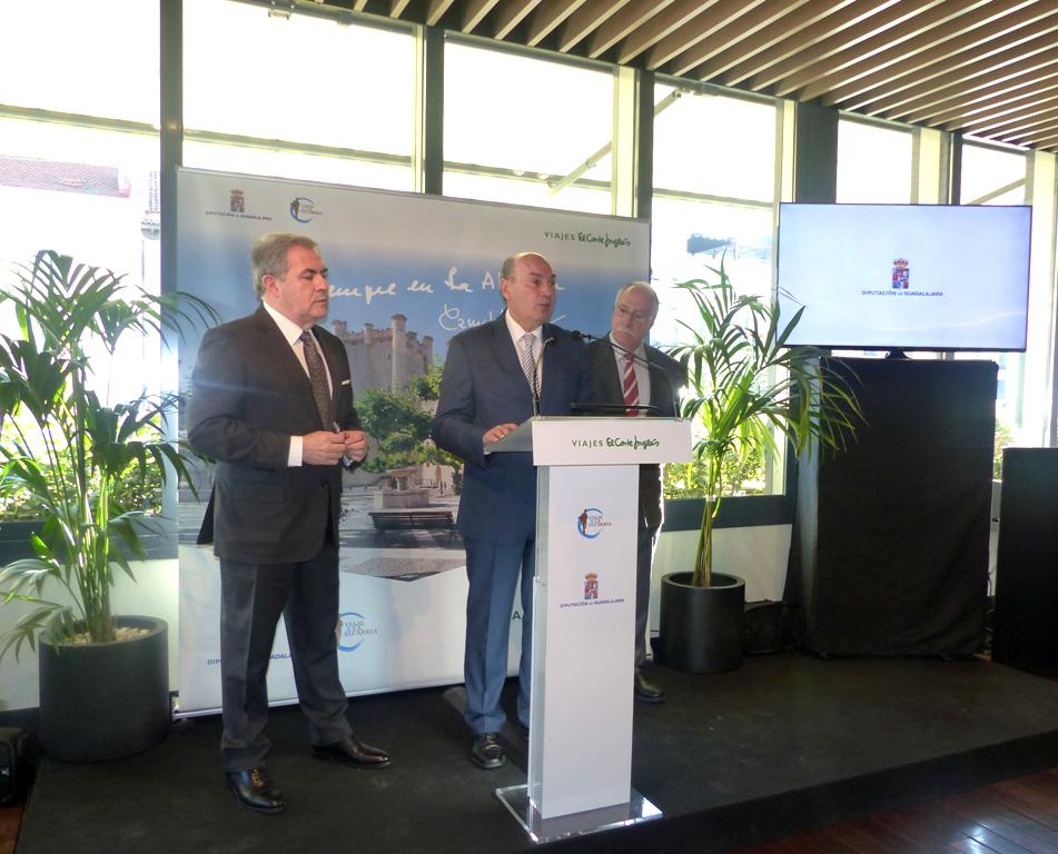 La Diputación de Guadalajara ha firmado un importante acuerdo con Viajes El Corte Inglés para promocionar Guadalajara y comercializar el paquete turístico ‘Viaja a la Alcarria’. La campaña ha sido presentada esta mañana en Madrid por el presidente de la Diputación Provincial de Guadalajara, José Manuel Latre; Camilo José Cela Conde, hijo del Premio Nobel, catedrático de Filosofía del Derecho, Moral y Política, y presidente de la Fundación Charo y Camilo José Cela, y el director de Comunicación y Promoción de Viajes El Corte Inglés, Fernando Tomás Ginés, en el centro que la firma tiene en la calle Serrano de la capital. En la misma también ha estado presente el diputado delegado de Turismo, Jesús Parra.