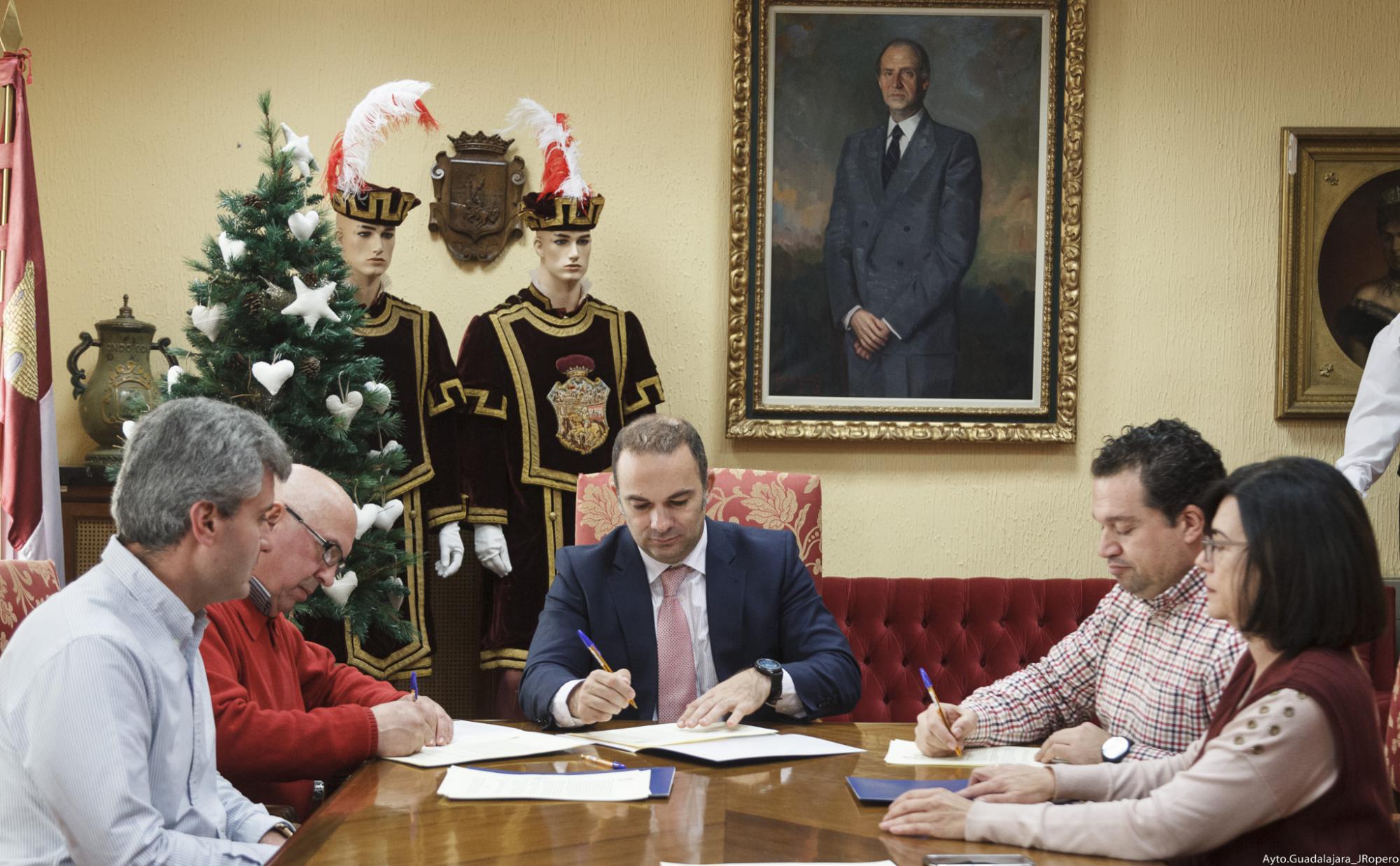 El vicealcalde de Guadalajara, Jaime Carnicero, y los responsables de la Federación de Asociaciones de Pymes y Autónomos del Comercio de la provincia de Guadalajara (FEDECO) y de la Federación Provincial de Asociaciones de Comercio y Servicios de Guadalajara (FCG), han suscrito en el Ayuntamiento el acuerdo de colaboración entre el Ayuntamiento de la capital y los Patronatos de Cultura y Deportes y las citadas asociaciones.