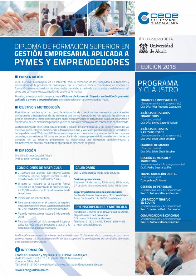 CEOE-CEPYME Guadalajara, ha organizado el diploma de formación superior en Gestión empresarial aplicada a pymes y emprendedores. Un curso que en 2018 desarrollará su primera edición y que cuenta con la categoría de título propio de la Universidad de Alcalá.