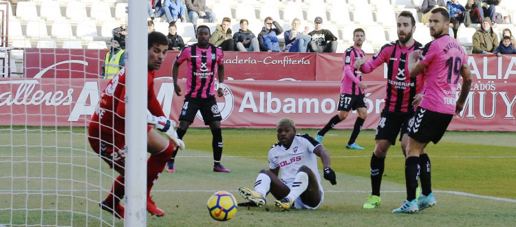 El Alba empezó 2018 tal y como lo acabó en el Carlos Belmonte, imponiendo su estilo. Los primeros minutos discurrieron en campo del CD Tenerife, llegando incluso a anotar un tanto a los 7 minutos que fue anulado por el árbitro por entender que había habido falta en el salto hacia un esférico centrado por Susaeta. A los 15 minutos, Bela hacia una jugada marca del francés para buscarse hueco desde el lateral del área y buscar el palo largo, elegante lanzamiento que atajó el meta visitante.