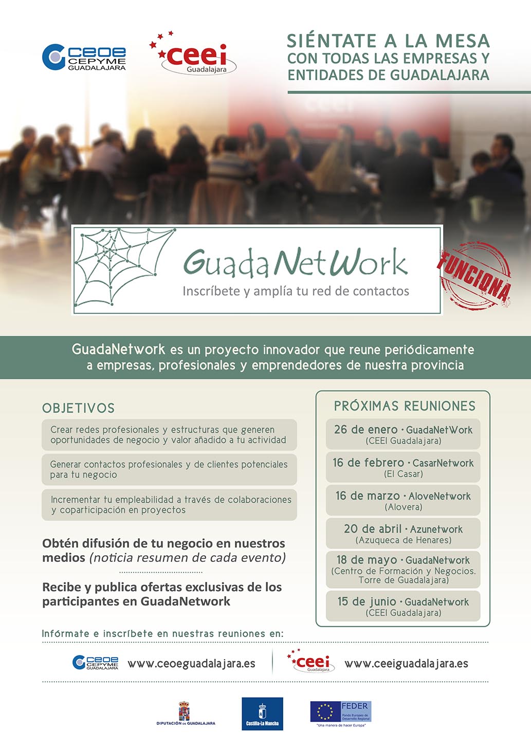Un proyecto, GuadaNetWork, creado conjuntamente entre CEOE-CEPYME Guadalajara y el CEEI alcarreño, con la colaboración de la Diputación provincial de Guadalajara y la Junta de Comunidades de Castilla-La Mancha, así como los ayuntamientos de las localidades donde se celebran los encuentros.