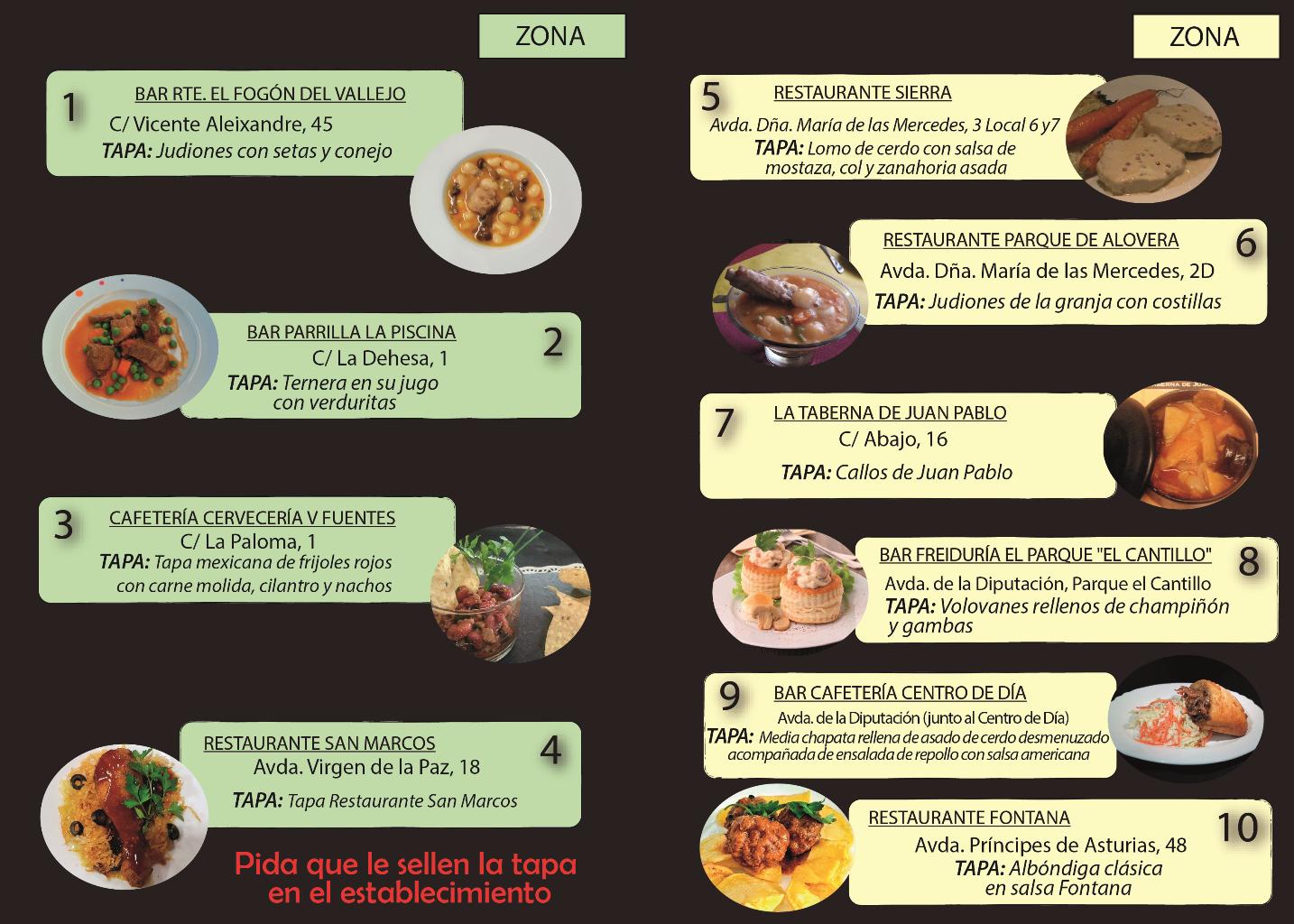 Cada uno de ellos presentará una tapa que podrá ser votada para ganar en el Concurso a la Mejor Tapa. Como en otras ocasiones, los bares y restaurantes están divididos en tres zonas, por lo que para que la votación sea válida se deberá obtener un sello en al menos dos tapas de cada zona.