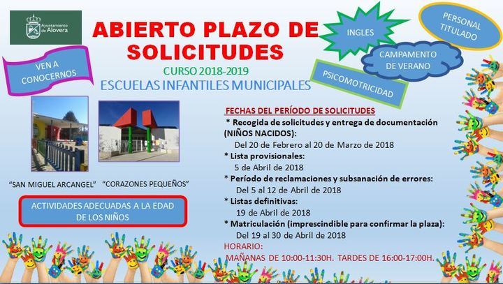 Del 20 de febrero al 20 de marzo las familias que lo deseen podrán solicitar plaza en las Escuelas Infantiles Municipales San Miguel Arcángel y Corazones Pequeños para el curso 2018/2019.