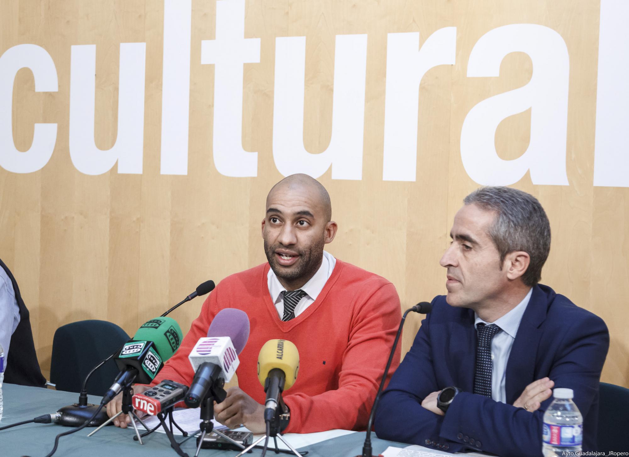 El teniente de alcalde y concejal de Cultura, Armengol Engonga; y el director de Instituciones de CaixaBank en Guadalajara, Francisco Javier Escamilla, han presentado hoy, en la Sala Tragaluz del Teatro Auditorio Buero Vallejo, el espectáculo escolar Los Moussakis. Música de los Balcanes.